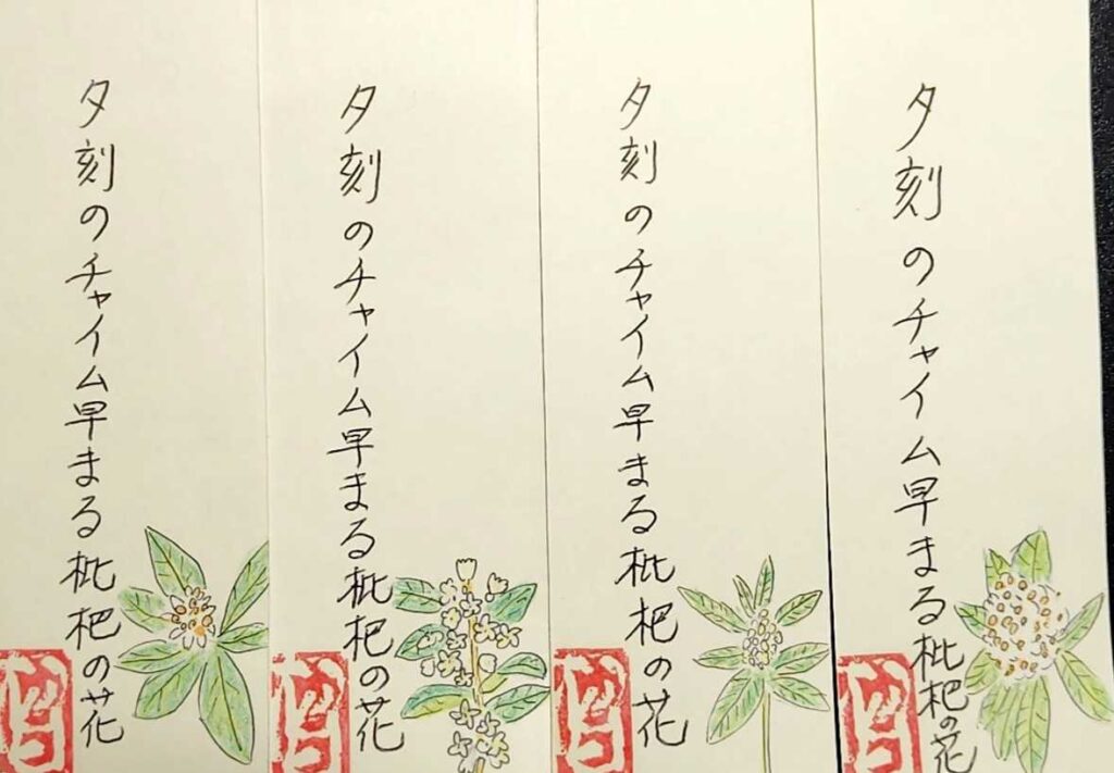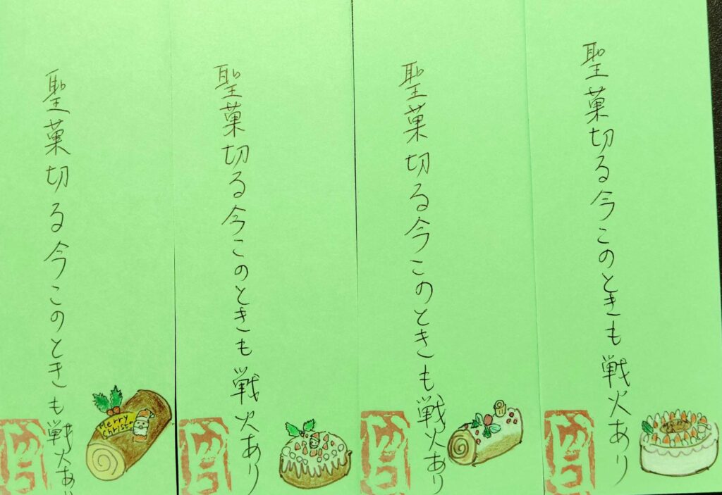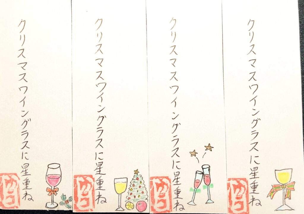 冬至も過ぎ、師走ももうあとわずか、クリスマスや新年の準備に気忙しく動きながらも何かときめく年の暮れ。今回はそんな時期を詠まれた利用者さんの俳句を、1枚1枚違えたお母様の絵が添えられた栞の写真をご紹介しながらお話したいと思います。