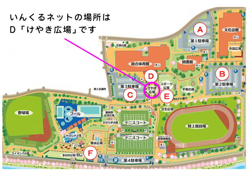 いんくるネットの販売場所は総合体育館前、けやき広場にて出店をします。